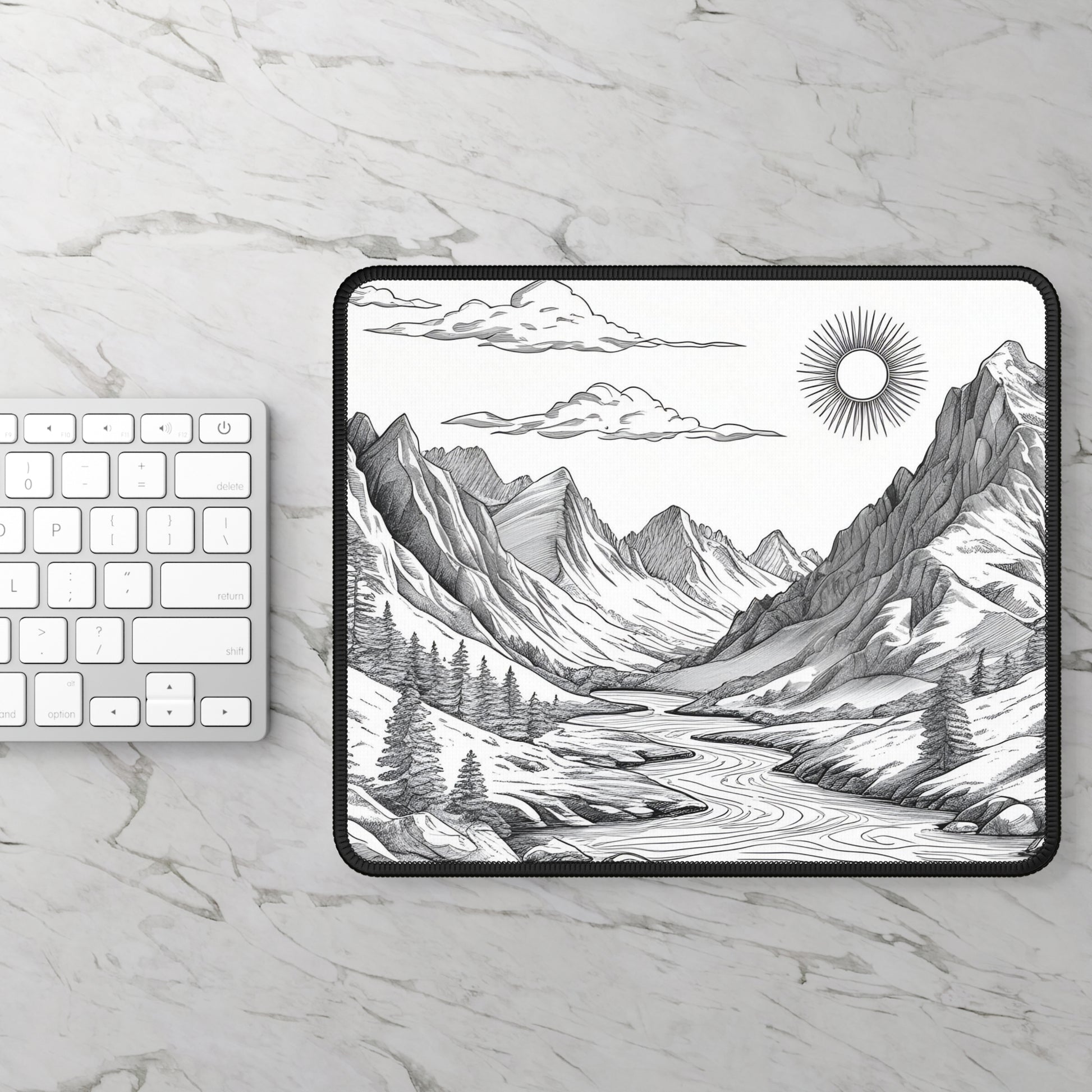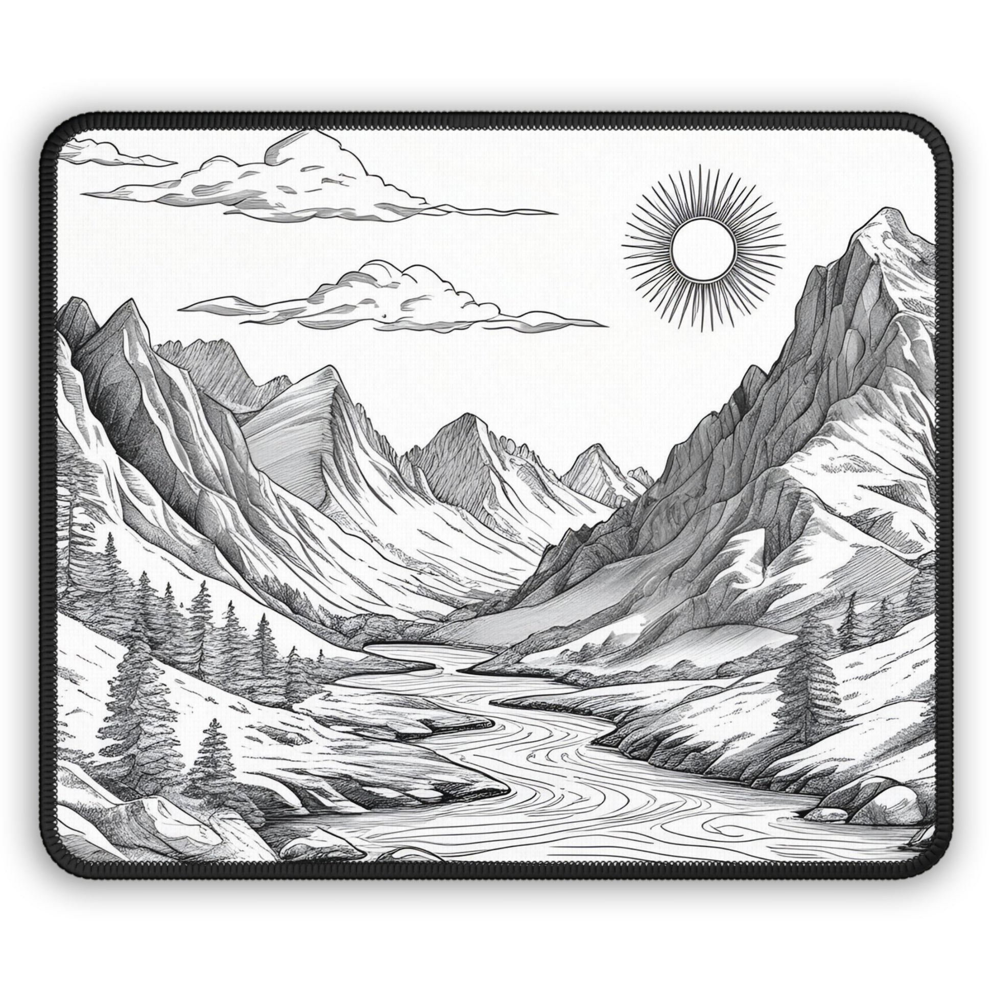 The Sunwatch Valley Mouse Pad | Analog Series features a tranquil landscape inspired by open valleys, winding rivers, and quiet mountain horizons. Its monochrome illustration brings a sense of balance, depth, and stillness to your workspace.